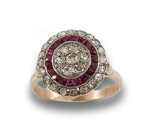 SORTIJA OJO DE PERDIZ DE DIAMANTES Y RUBÍES, EN ORO AMARILL