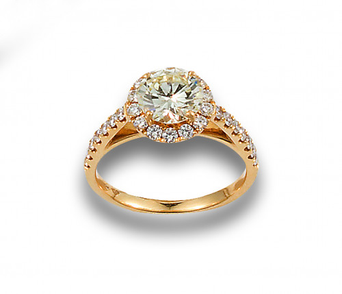 Sortija rosetón de oro amarillo de 18 kt. Formada por un diamante central, talla brillante, de 1.54 ct. Color L, Pureza SI2, orlado y flanqueado por diamantes, talla brillante, peso total de 0.55 ct. Color F, Pureza VS. Se adjunta certificado GEM REPORT ANTWERP Nº 1820001924 AN.