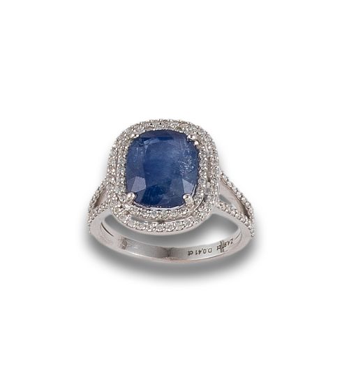 Sortija doble rosetón de oro blanco de 18K formada por centro de zafiro Burma, sin indicaciones de calentamiento, talla cojín, de 4.97 ct. y diamantes talla brillante y peso total aproximado de 0.40 ct. Se acompaña de certificado C. DUNAIGRE Nº CDC 2305264. Peso: 5.4 g.