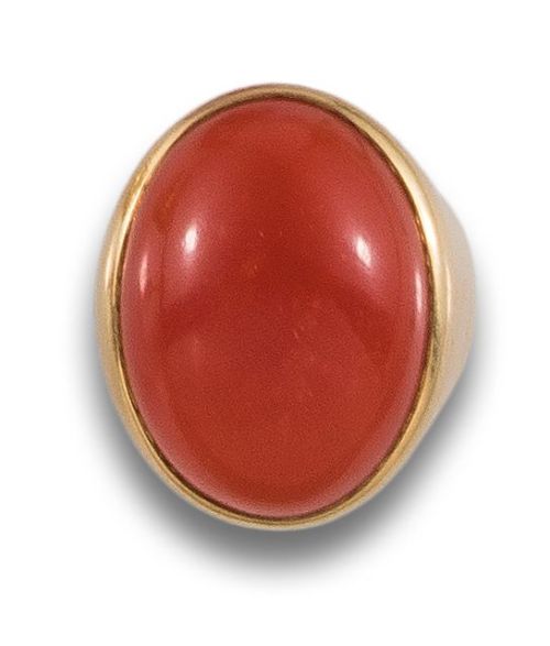 Sortija de oro amarillo de 18K formada por un coral en talla cabujón. Peso: 15 g.