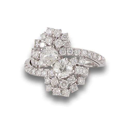Sortija tú y yo de oro blanco de 18 kt. Diseño floral formado por dos diamantes centrales, talla antigua, orlados de diamantes, talla brillante, peso total estimado de 2.60 ct. Engaste en garras.