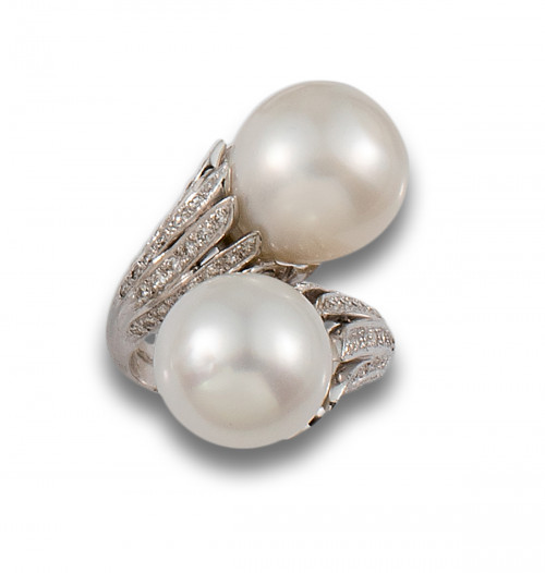 Sortija tú y yo de oro blanco de 18 kt. formada por dos perlas australianas calibradas en 14 mm. de diámetro y bandas cuajadas de diamantes, talla brillante, peso total estimado de 0.85 ct.
