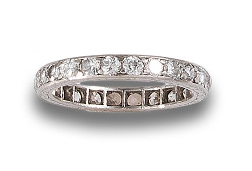 Sortija alianza sin fin de oro blanco de 18 kt. Formada por hilera de diamantes, talla antigua. Talla: 10. Engaste en grano.