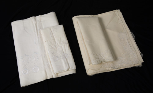 Sábana de matrimonio de hilo blanco con bordados de flores en el mismo color. Con funda de almohada. Manchas.