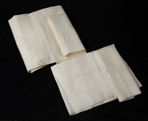 Sábana de matrimonio de hilo crudo con bordados y bodoques de hilo blanco. Iniciales "CFC"