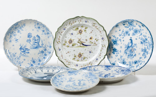 Seis platos de cerámica levantina, siguiendo modelos de Alcora, S. XX. Cinco de ellos con decoración esmaltada azul y blanco y uno con esmalte polícromo. Uno marcado "LMN Alcora, M.E."