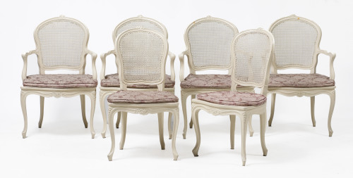 Seis sillas, cuatro de ellas de brazos de estilo Luis XV, E