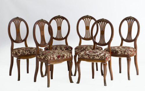 Seis sillas de madera de roble, S. XX. Respaldo ovalado y aplicaciones de metal dorado. Precisan retapizado.