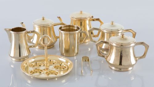 Compuesto por: salvilla con compartimentos para recipientes, un filtro de te, dos teteras, dos azucareros, jarra de leche y pinzas para azucarillos. Algunas piezas grabadas con inscripción "Hotel Ritz" o con emblema de Madrid y filactelia "Hotel Ritz Madrid". Presenta algunas abolladuras, manchas y marcas de uso.