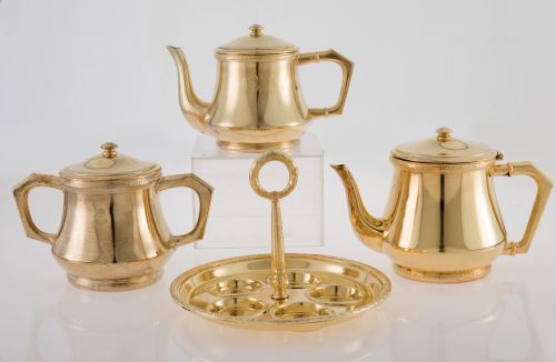 Compuesto por: una salvilla con compartimentos para recipientes, dos teteras y un azucarero. Una tetera y el azucarero grabados con el emblema de Madrid y filactelia "Hotel Ritz Madrid". Presentan pequeñas manchas y marcas de uso.