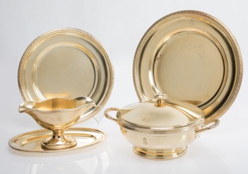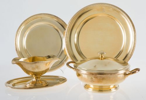 Compuesto por: dos fuentes circulares de diferentes tamaños, una salsera y una legumbrera. Todas ellas grabadas con el emblema de Madrid y filactelia "Hotel Ritz Madrid". Presentan abolladuras, manchas y marcas de uso.