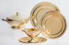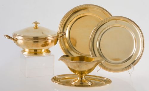 Compuesto por: dos fuentes circulares de diferentes tamaños, una salsera y una legumbrera. Todas ellas grabadas con el emblema de Madrid y filactelia "Hotel Ritz Madrid". Presentan abolladuras, manchas y marcas de uso.