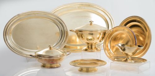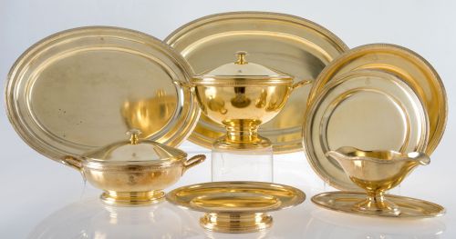 Compuesto por: dos fuentes ovaladas de diferentes tamaños, dos fuentes circulares de diferentes tamaños, una salvilla, una salsera, una sopera y una legumbrera. Todas ellas grabadas con el emblema de Madrid y filactelia "Hotel Ritz Madrid". Presentan abolladuras, manchas y marcas de uso.