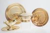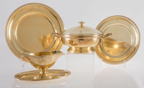 Compuesto por: dos fuentes circulares de diferentes tamaños, una salsera y una legumbrera. Todas ellas grabadas con el emblema de Madrid y filactelia "Hotel Ritz Madrid". Presentan abolladuras, manchas y marcas de uso.