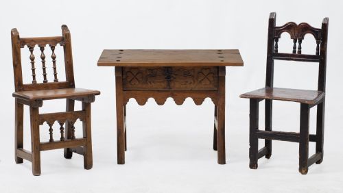 Silla popular de pino teñido, España, S. XVIII. Con respaldo tallado con columnillas torneadas.
