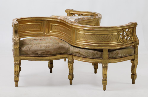 Sillón confidente siguiendo modelos del S. XIX posiblemente Herráiz, España, med. S. XX. De madera tallada y dorada. Faltas.
