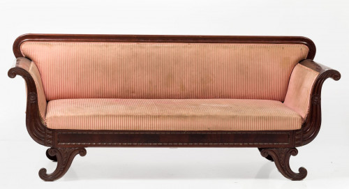Sofá estilo Imperio S.XIX en madera de caoba con talla de volutas. Una pata restaurada y necesita repaso en la trasera