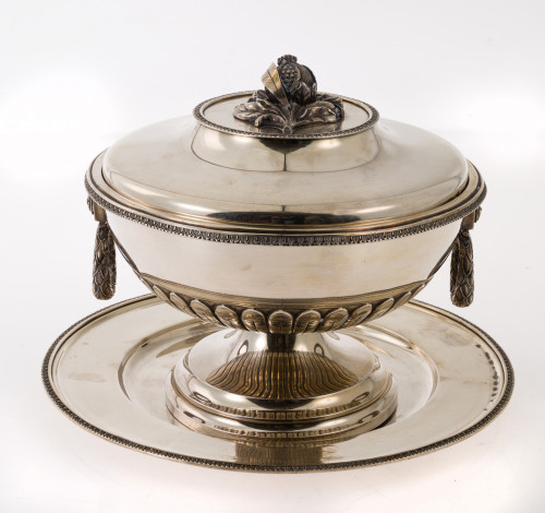 Sopera, con plato, en plata portuguesa, marcas de Lisboa ley 916. Perfil circular con decoración de gallones y greca de palmetas. Peso total: 2.320 gr.