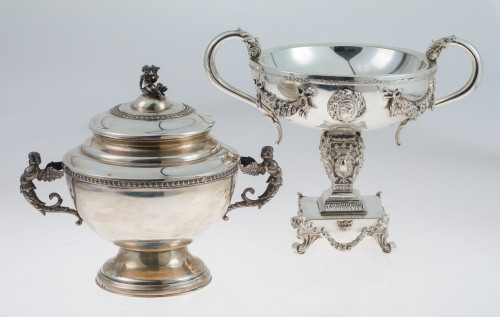 Sopera de plata española contrastada ley 916. Con decoración de greca gallonada y asas en forma de faunos. Tapa rematada en figura representando a Neptuno.