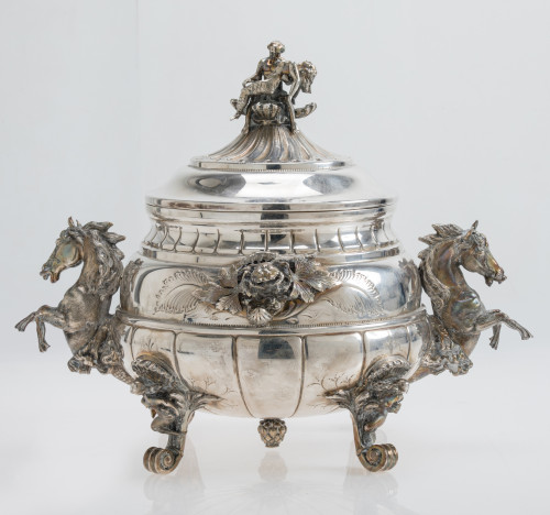 Sopera de plata sterling punzonada, ley 925. Con decoración en altorelieve con asas lateras de caballos rampantes y sirenas en las patas. Ramilletes florales y vegetales, gallones... Peso: 3.325 gr.