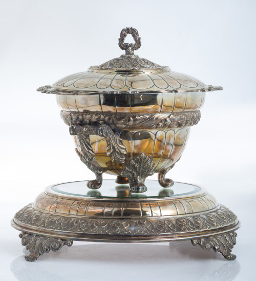 Conjunto de sopera, con platos presentador, en plata española ley 916. Decoración de gallones y volutas de acantos. Plato con alma de madera y centro de espejo.