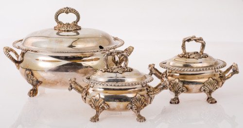 Sopera y pareja de salseras asociadas de metal plateado, Inglaterra, pps.S.XX