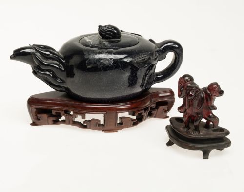Tetera de cuarzo aventurina azul y figura de "los tres monos sabios" de resina, China, S. XX.