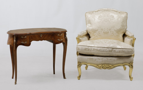 De madera chapada en palo rosa con perfil de riñón, tapa superior abatible con espejo y 3 cajones en el frente (1 de ellos doble) y con aplicaciones de metal dorado.