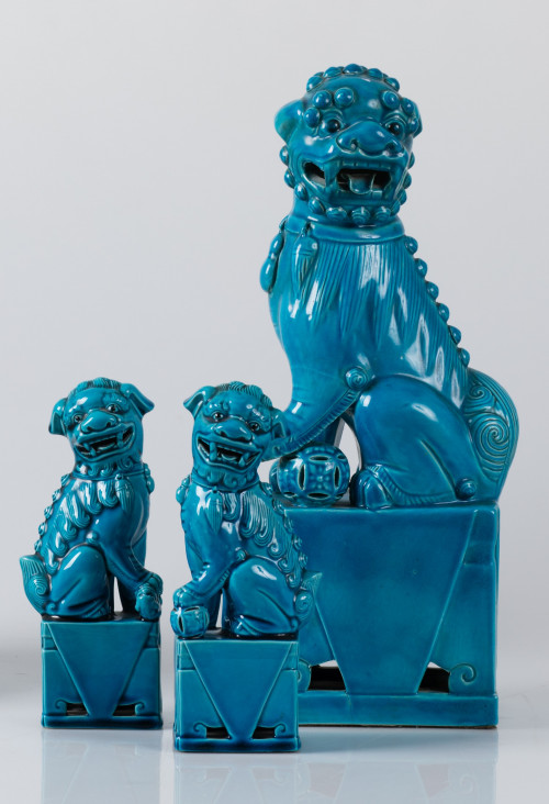 Tres leones de Fo de porcelana esmaltada en azul turquesa, China, S. XX. Dos de ellos más pequeños.