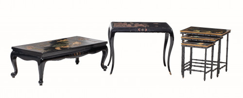 Tres mesas nido de gusto oriental, S. XX. Con patas simulando bambú lacadas en negro y tapas simulando lacas china con personajes orientales. Faltas en las tapas.