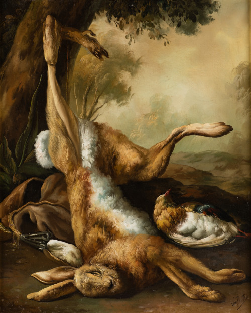 "Naturaleza muerta con caza en paisaje"