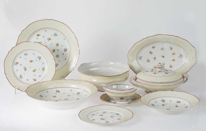 Vajilla de porcelana blanca esmaltada, Limoge, Francia. Con decoración estampada de flores en policromía y filo en color vino. Compuesta por: 17 platos llanos, 6 platos hondos, 6 platos de postre, 2 fuentes circulares, 1 fuente ovalada,  1 frutero, 2 soperas y 1 salsera. Marcas en la base. Piquetes y restauraciones.