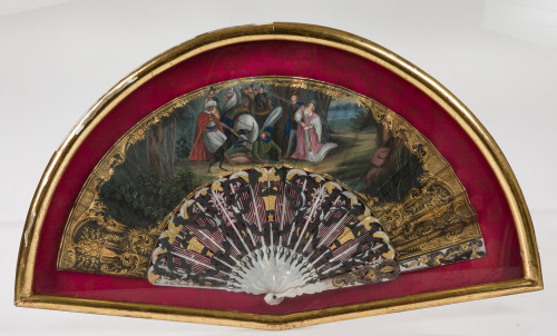 Abanico S XIX con país en papel decorado a la acuarela y varillaje de madreperla calada y dorada. Se presenta en abaniquera.