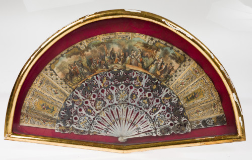 Abanico Isabelino s.XIX con pais en papel litografiado iluminado y varillaje de madreperla calado. Se presenta en abaniquera Medidas: 27 cm