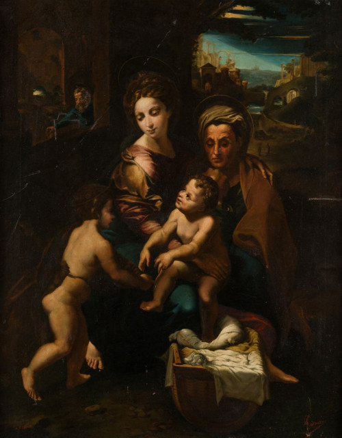 Firmado en el ámgulo inferior derecho e inscrito " es copia " en el ángulo inferior izquierdo Obra que copia al original de Rafael conservado en el Museo Nacional del Prado