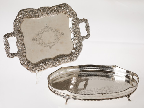 Bandeja en plata española ley 916, con asas laterales. Decoración de hojas de parra y racimos de uvas. Peso: 1.095 gr.