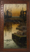 "Claro de luna en la Vía Apia" 1896 Firmados y fechados en el registro inferior "Enrique Serra/Roma-1896" Formado en Barcelona con Ramón Martí Alsina, Enrique Serra completó su formación en Roma, una ciudad en la que conoció y entabló amistad con Mariano Fortuny. Allí asistió a la Academia Chigi y alcanzó una notable fama con sus obras, cultivando la pintura de género y el paisaje. Los paisajes son lo más representativo de su producción y están realizados con un estilo realista muy personal, de dibujo preciso y meticuloso, pero unas claras connotaciones románticas como puede apreciarse en esta pareja de imponentes paisajes romanos que representan la Laguna Pontina y la Vía Apia. Destacan por su alarde compositivo y su gran tamaño, a lo que debe sumarse el hecho de conservar sus respectivos marcos originales realizados en madera de nogal con una profusa decoración de ovas y dardos en sus cantos, y perlados alternados con canutillos en los filos. Sus entrecalles presentan una decoración vegetal de hiedras trepadoras y motivos militares romanos a base de cartelas, panoplias, coronas de laurel, las “aquilae” de las legiones y medallones con retratos de emperadores. En los lienzos, la belleza de estos espacios naturales está bañada por una tenue luz crepuscular, en el primer caso, y por una la luminosidad lunar azulada, en el segundo. En ambos destacan las calidades plásticas en la elaboración de la vegetación, el reflejo en las aguas, los celajes y los fragmentos escultóricos abandonados, cubiertos por vegetación, haciendo constar el paso del tiempo y otorgando a la composición una atmósfera poética y melancólica.