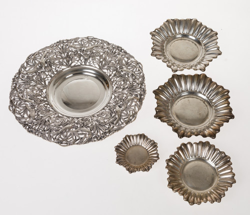 Lote compuesto por cuatro centros de plata de ley española 916. Decoración con gallones. Peso total: 260 gr.