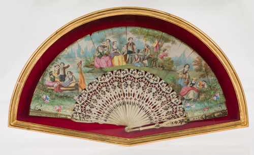 Lote de dos abanicos s.XIX, uno con pais de papel litografíado e iluminado con barillaje de madreperla calada (26 cm); el otro, pais de papel litografiado e iluminado con barillaje de hueso calado (26 cm). Puntuales deterioros Se presentan en baniqueras