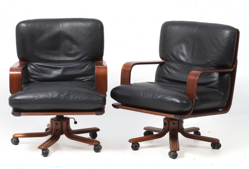 Pareja de sillones giratorios de despacho, años 80, de la casa AG Barcelona. Asiento y respaldo tapizados en cuero color negro. Pie con cinco ruedas.