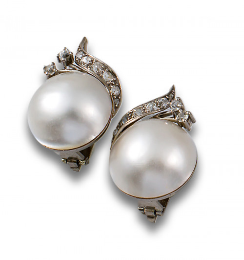 Pendientes, años 60, de platino, formados por perlas mabé calibradas de 18 mm. y diamantes, talla antigua.