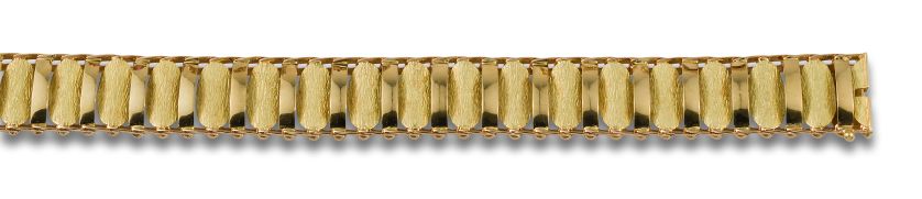 Pulsera, años 70, de eslabones lisos y mates de oro amarillo de 18 kt. Con cadenita de seguridad. Peso: 36,80 gr. Peso: 36,80 gr.