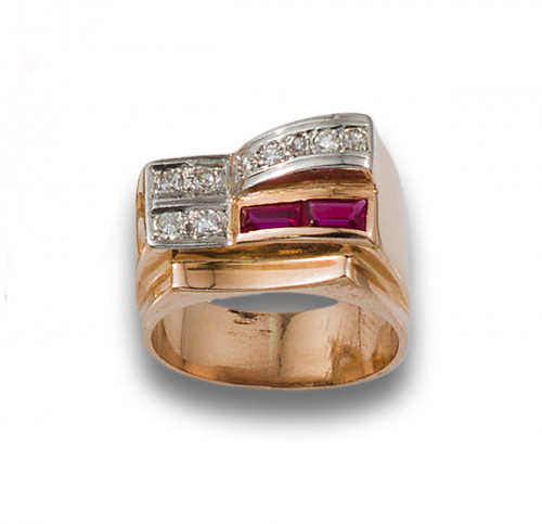 Sortija chevalier, años 40, de oro rosa de 18 kt. y vistas en platino, con detalle de diamantes y rubíes sintéticos, propios de la época.
