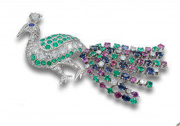 BROCHE PAVO REAL DE DIAMANTES, ESMERALDAS, ZAFIROS Y RUBÍES, EN ORO BLANCO