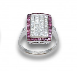 SORTIJA, ESTILO ART DECO, DE DIAMANTES, RUBÍES Y PLATINO