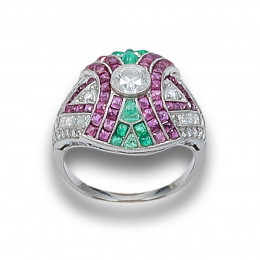 SORTIJA BOMBÉ ESTILO ART DECÓ EN ORO, CON DIAMANTES, ESMERALDAS Y RUBÍES