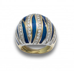 SORTIJA BOMBÉ DE CIRCONITAS Y ESMALTES AZULES, EN ORO AMARILLO