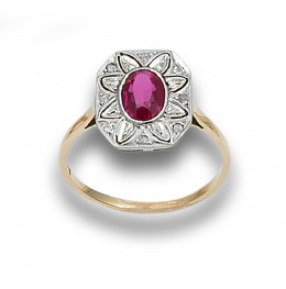 SORTIJA ANTIGUA DE DIAMANTES Y RUBÍ SINTÉTICO, EN ORO AMARILLO Y PLATINO