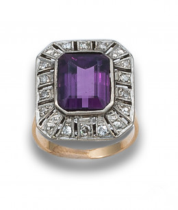 SORTIJA, AÑOS 30, DE DIAMANTES, AMATISTA SINTÉTICA, ORO Y PLATINO