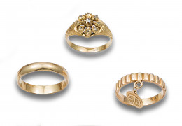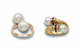 LOTE DE DOS SORTIJAS DE ORO, PERLAS Y RUBÍES
